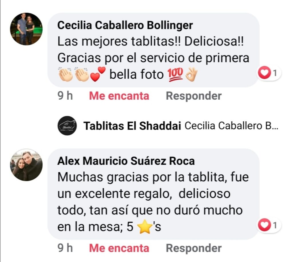 Bienvenidos a ... Acompañamos tus mejores momentos Se acerca el Día del Niño, obtén tu descuento del 15% en la SWEET BOX! Oferta por tiempo limitado: click aqui! 00Días 00Horas 00Minutos 00Segundos CONOCE NUESTRAS OPCIONES: TABLA FAMILIAR 5 - 6 Personas (380bs) TABLITA MIX DE SABORES 2 Personas (160bs) TABLITA BOX c/corona 1-2 Personas (120bs) TABLITA BOX SHADDAI 1-2 personas (160bs) TABLITA CORAZON 1 PERSONA (90bs) TABLITA PIQUEO SEPARADO 2-3 Personas (180bs) HAZ TU PEDIDO Realizamos Tablitas personales y grupales, ideal para regalo o para compartir con amigos o familia. Si deseas personalizar o agregar algún detalle como globo, tarjeta o vino escríbenos. Name Email Message Send Testimonio Clientes Satisfechos. Celebra con Tablitas El Shaddai! Galería de Cumpleañeros Aniversarios Día del Padre, Día de la Madre, Navidad, Tesis....etc Visítanos en: Sigue nuestras redes sociales: Whatsapp Facebook Instagram Tiktok